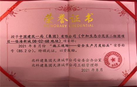 2021年9月,北科建天津城市公司安委会领导小组公布《8月份安全生产月度标兵项目公告》,中加生态示范区二组团项目在各项目中脱颖而出,以85.2分排名第一的成绩荣获2021年8月份“施工现场-安全生产月度标兵”工地荣誉称号。